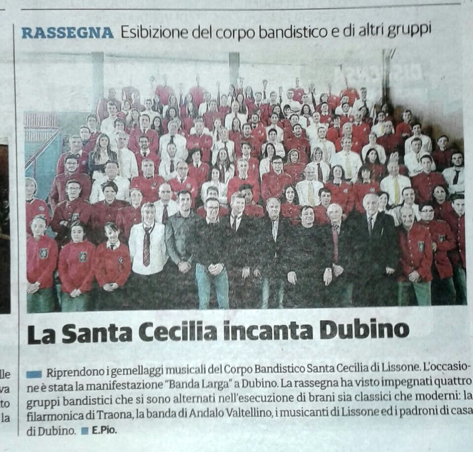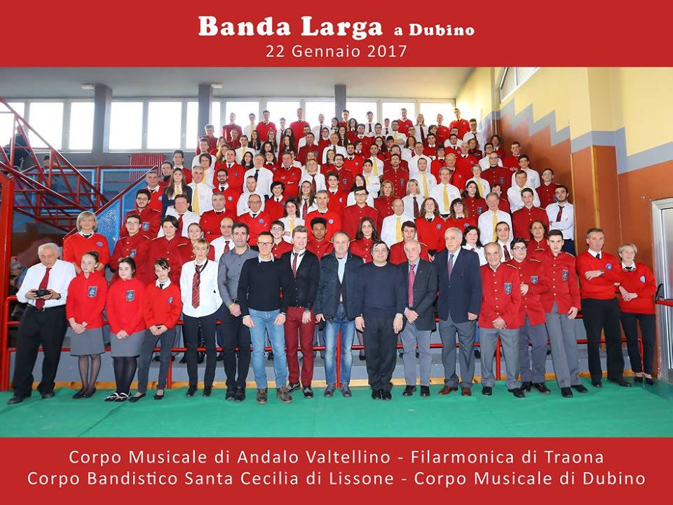 I nostri musicanti hanno riscosso grande apprezzamento dal pubblico di Dubino intervenuto alla manifestazione "Banda Larga" domenica 22 gennaio, tanto da venirei richiesto un "bis" alla fine del nostro programma ufficiale. I nostri brani sono risultati allegri e trascinanti, attentamente diretti dal Maestro Roberto Turriani. E' stata davvero una bella esperienza, specie per i più giovani per alcuni dei quali era anche la prima trasferta in assoluto.